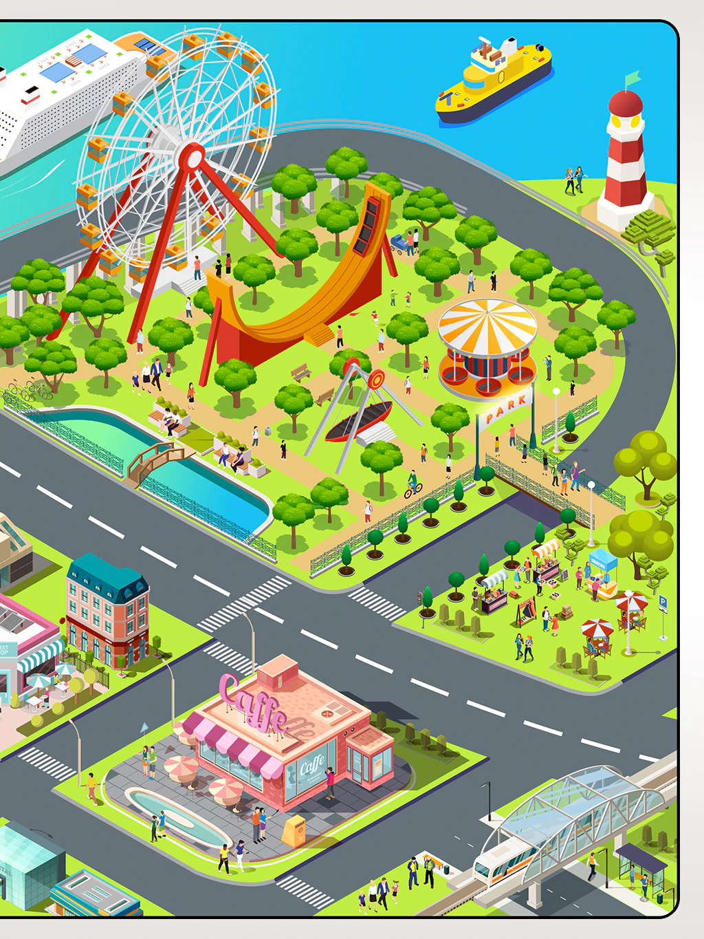 COSTA MAGICA, una colorida ciudad costera para pasear con autitos y recorrer cada rincón, estación de tren, cine, bares, restorantes, parque de diversiones, puerto, barcos, playa, faro y mucho mas!.